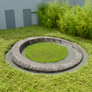 - 日本庭園の手法を現代風にアレンジすることが得意な庭園作家。和=輪ととらえて、中庭にリング状の景石(けいせき)をデザインしたそうです。